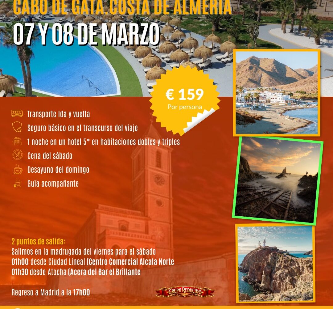 Escapada 7 y 8 de marzo Descubre uno de los paisajes más singulares del Mediterráneo en una escapada diseñada para desconectar, disfrutar y dejarte sorprender. Cabo de Gata te espera con su combinación única de calas volcánicas, pueblos blancos, aguas cristalinas y una luz incomparable que convierte cada rincón en una experiencia inolvidable. Durante dos días recorreremos la costa almeriense, donde el mar y la montaña se funden en un entorno natural protegido de extraordinaria belleza. Pasearemos por enclaves emblemáticos, contemplaremos acantilados modelados por el viento y el tiempo, y disfrutaremos de la autenticidad de sus pequeñas localidades marineras. La experiencia incluye transporte de ida y vuelta desde Madrid, seguro básico de viaje y guía acompañante durante todo el recorrido para que solo tengas que preocuparte de vivir el momento. Nos alojaremos una noche en hotel 5 estrellas en habitaciones dobles y triples, garantizando comodidad y descanso en un entorno privilegiado. El sábado por la noche compartiremos una cena incluida en el programa y el domingo comenzaremos el día con desayuno antes de continuar nuestra ruta. 01:00 h – Ciudad Lineal (Centro Comercial Alcalá Norte) 01:30 h – Atocha Regreso previsto a Madrid a las 17:00 h. Una escapada perfecta para quienes buscan naturaleza, mar y desconexión en un entorno auténtico, sin complicaciones y con todas las comodidades incluidas. Precio: 159 € por persona Plazas limitadas. Reserva tu lugar y prepárate para descubrir Cabo de Gata en su mejor momento.Cabo de Gata – Costa de Almería
