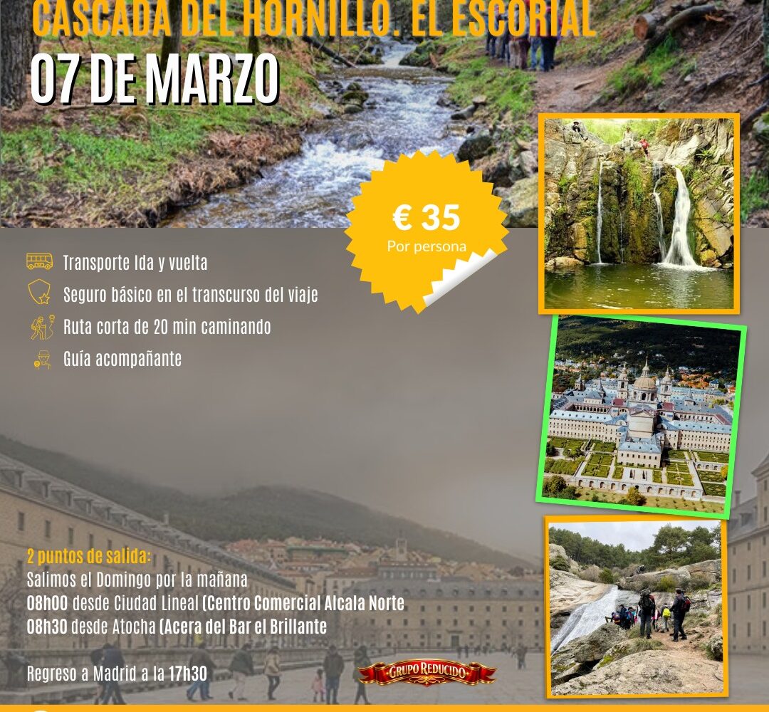 Salida 7 de marzo Una escapada de naturaleza perfecta para desconectar sin alejarse demasiado. La Cascada del Hornillo, en plena sierra de El Escorial, nos ofrece un entorno de bosque, agua y senderos tranquilos ideales para disfrutar de una jornada al aire libre. La ruta es sencilla y accesible, con una caminata aproximada de 20 minutos hasta alcanzar la cascada. El recorrido discurre junto a un arroyo entre pinares y formaciones rocosas, creando un paisaje fresco y agradable, especialmente en esta época del año. Durante la excursión contaremos con guía acompañante, que coordinará la actividad y aportará información sobre el entorno natural y la zona. Una propuesta ideal tanto para quienes desean iniciarse en el senderismo como para quienes simplemente buscan una mañana diferente en plena naturaleza. La experiencia incluye transporte ida y vuelta desde Madrid y seguro básico durante el viaje, para que solo tengas que preocuparte de disfrutar. 08:00 h – Ciudad Lineal (Centro Comercial Alcalá Norte) 08:30 h – Atocha Regreso previsto a Madrid a las 17:30 h. Precio: 35 € por persona Plazas limitadas. Una jornada accesible, natural y bien organizada para reconectar con el entorno en un enclave emblemático de la sierra madrileñaCascada del Hornillo – El Escorial