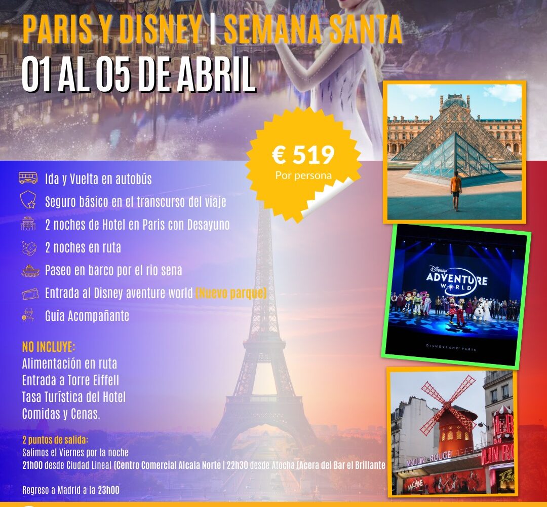 01 al 05 de abril Una escapada internacional diseñada para vivir la magia de París y la emoción de Disney en un mismo viaje. Cultura, historia, ocio y diversión se combinan en un programa completo pensado para disfrutar al máximo durante Semana Santa. París, una de las capitales más fascinantes del mundo, nos recibirá con su elegancia, sus grandes avenidas y su inconfundible atmósfera. Tendremos tiempo para recorrer sus barrios más emblemáticos, pasear junto al Sena y descubrir iconos como el entorno del Louvre, Montmartre o los Campos Elíseos. Además, realizaremos un paseo en barco por el río Sena, una forma única de contemplar la ciudad desde otra perspectiva. La experiencia se completa con la entrada al parque Disney Adventure World, donde atracciones, espectáculos y escenarios temáticos nos sumergirán en un universo de fantasía y entretenimiento para todas las edades. Un día para disfrutar sin límites en uno de los destinos más visitados de Europa. El viaje incluye ida y vuelta en autobús, seguro básico durante el trayecto, dos noches de hotel en París con desayuno y dos noches en ruta, además de guía acompañante durante toda la experiencia para garantizar organización y asistencia constant Alimentación en ruta Entrada a la Torre Eiffel Tasa turística del hotel Comidas y cenas 21:00 h – Ciudad Lineal (Centro Comercial Alcalá Norte) 22:30 h – Atocha Regreso previsto a Madrid a las 23:00 h. Una propuesta completa para quienes desean aprovechar Semana Santa con una experiencia internacional, combinando cultura europea y diversión en un mismo itinerario. Plazas limitadas. Reserva con antelación.París y Disney – Especial Semana Santa